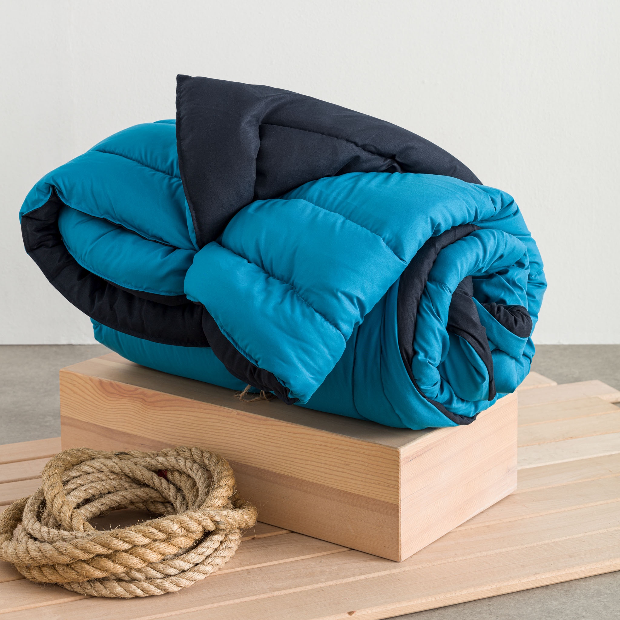 Double-sided quilt, from the Microfiber collection of the company Vesta Home. Each side is monochrome with different shades, on the one hand blue and on the other dark blue. The cover is made of 100% microfiber fabric 0.85 gr while the filling is 100% silicone polyester. Available in two sizes, single with dimensions 160 x 230 cm and king size with dimensions 220 x 230 cm. Comes packed in PVC suitcase for easy transport and storage.